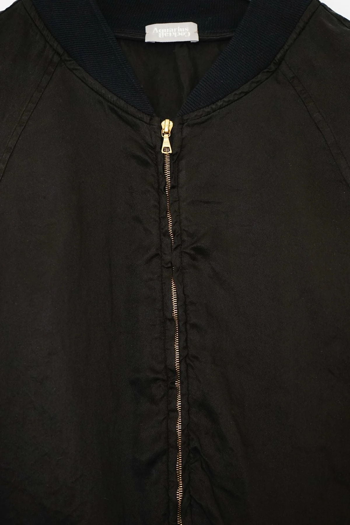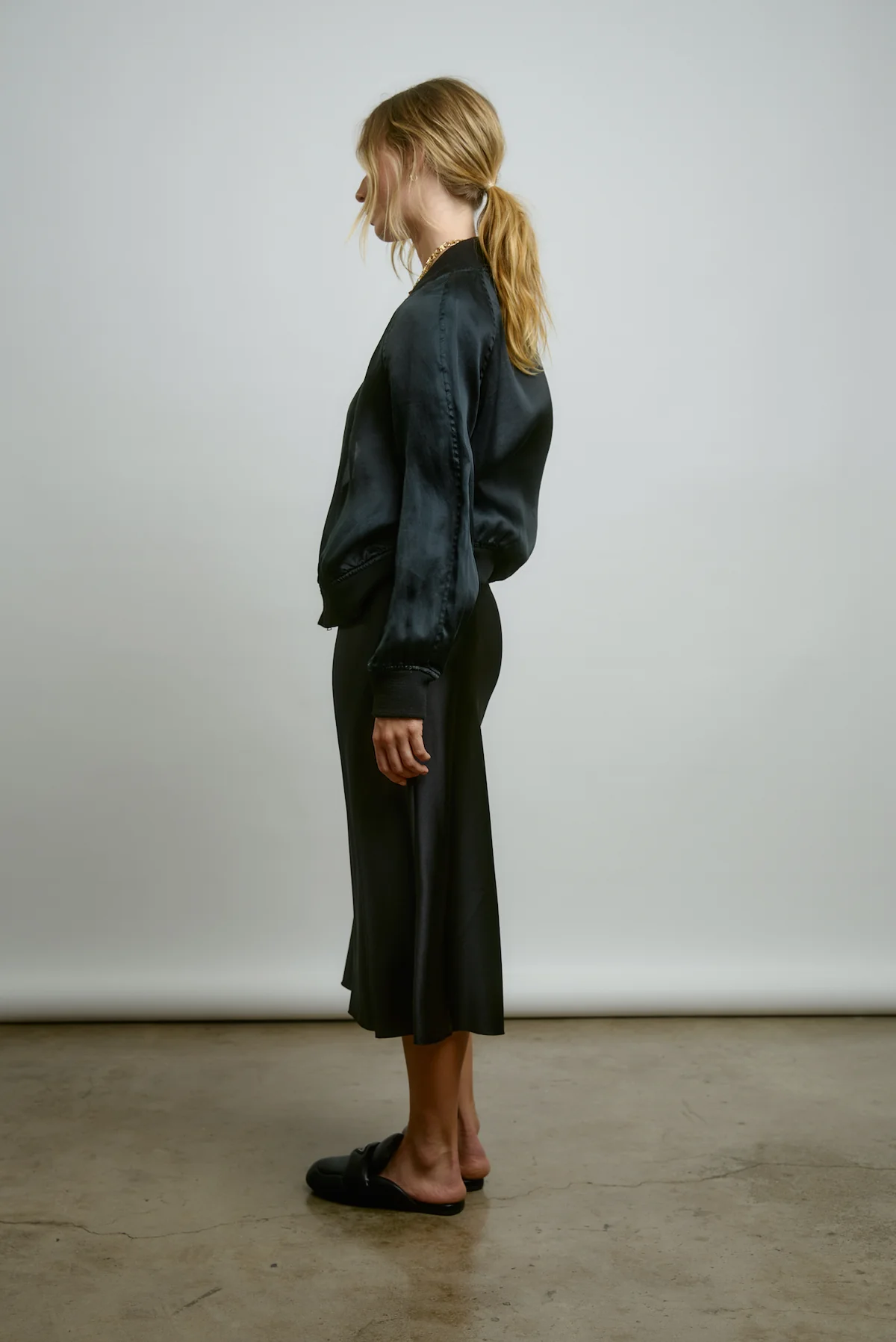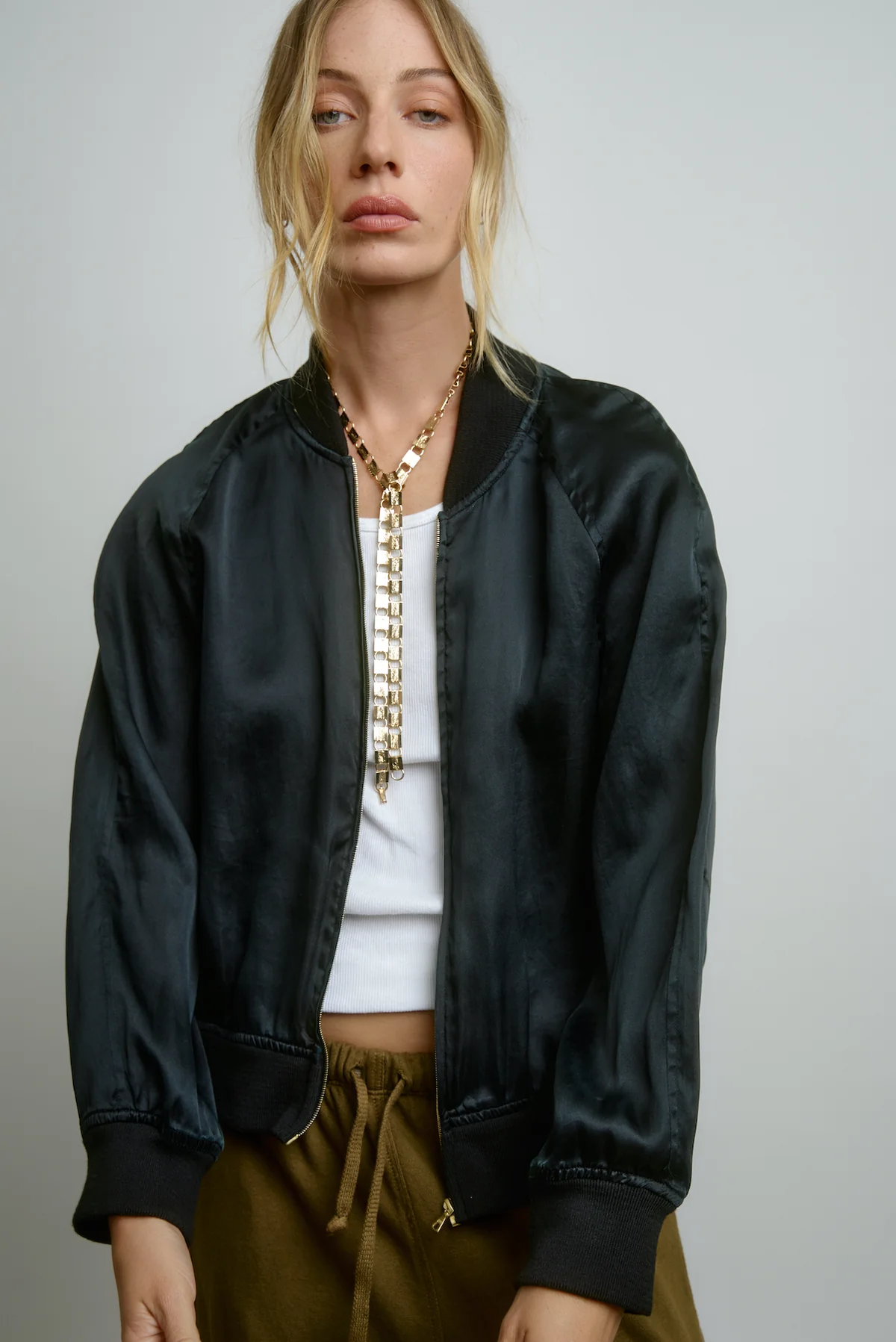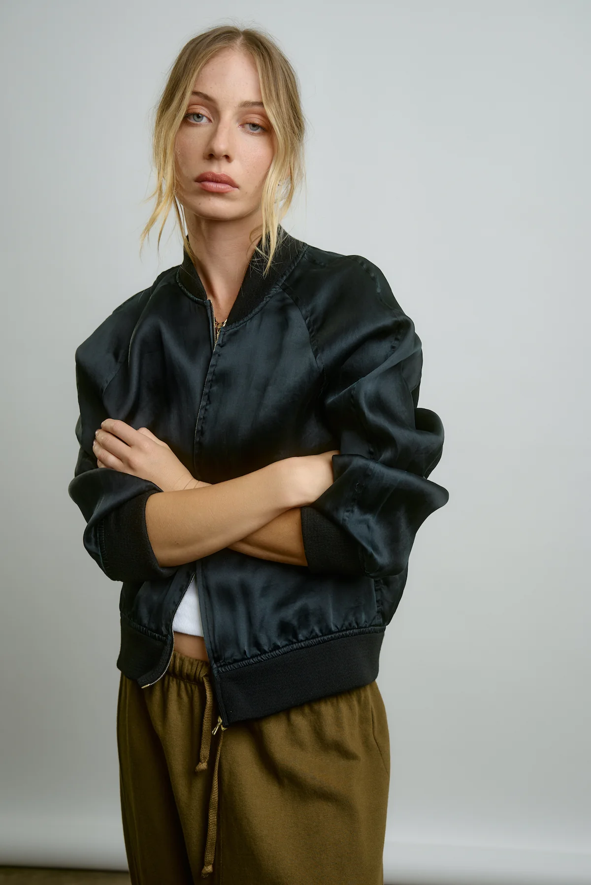 Dressed up edge personifies this classic bomber style cut from translucent silk organza. A roomy raglan sleeve, delicate gold zipper, tonal rib trim and French seams finish off this extraordinary everyday jacket. Toss over a slip dress, t-shirt or blouse to transform your look.
