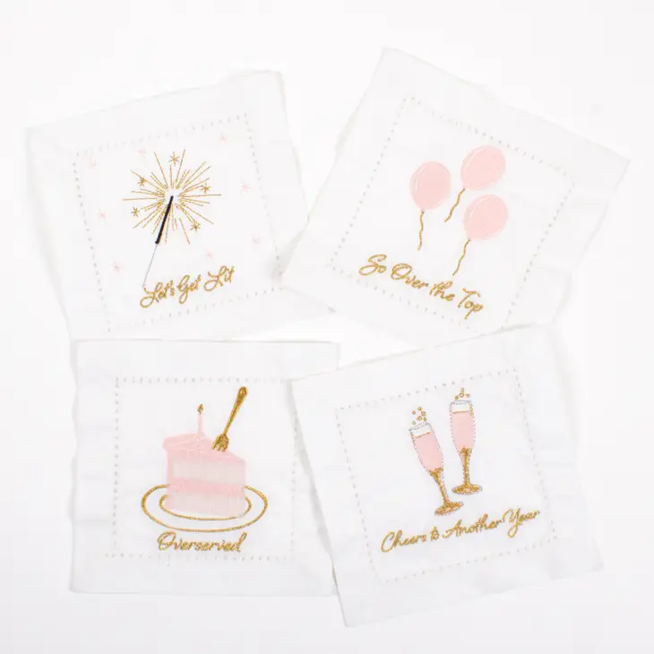 Bring celebration and fun to any event with our Birthday Girl Embroidered Cocktail Napkin Set. These crisp white napkins are adorned with chic embroidery that add a unique and witty flare to your ordinary napkin sets, making them the perfect conversation starter at birthdays of all types! This set of four comes in a box for easy gifting and can be matched with either our gold or natural rattan napkin holders for added elegance.